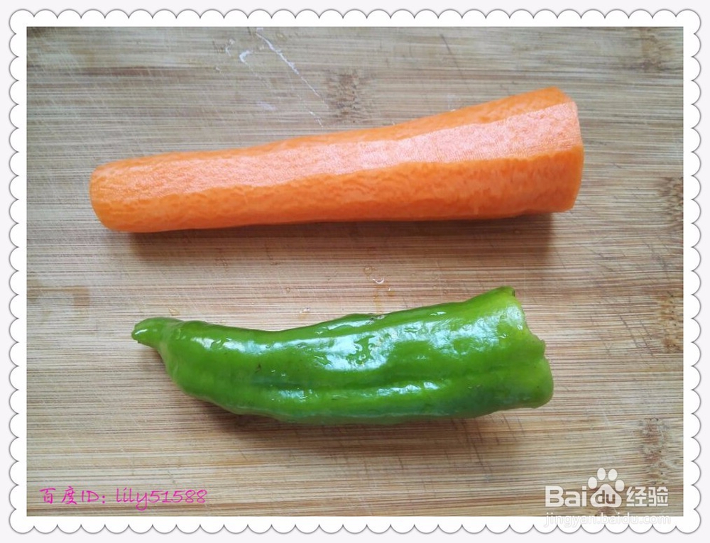 2、准备一个胡萝卜和青椒,分别将胡萝卜和青椒、大蒜切丁。