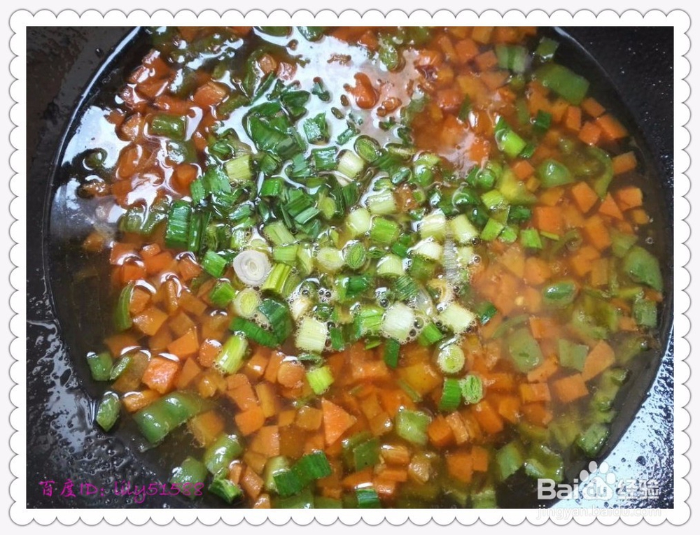 9、在胡萝卜和青椒的锅内,加入一碗的清水。
