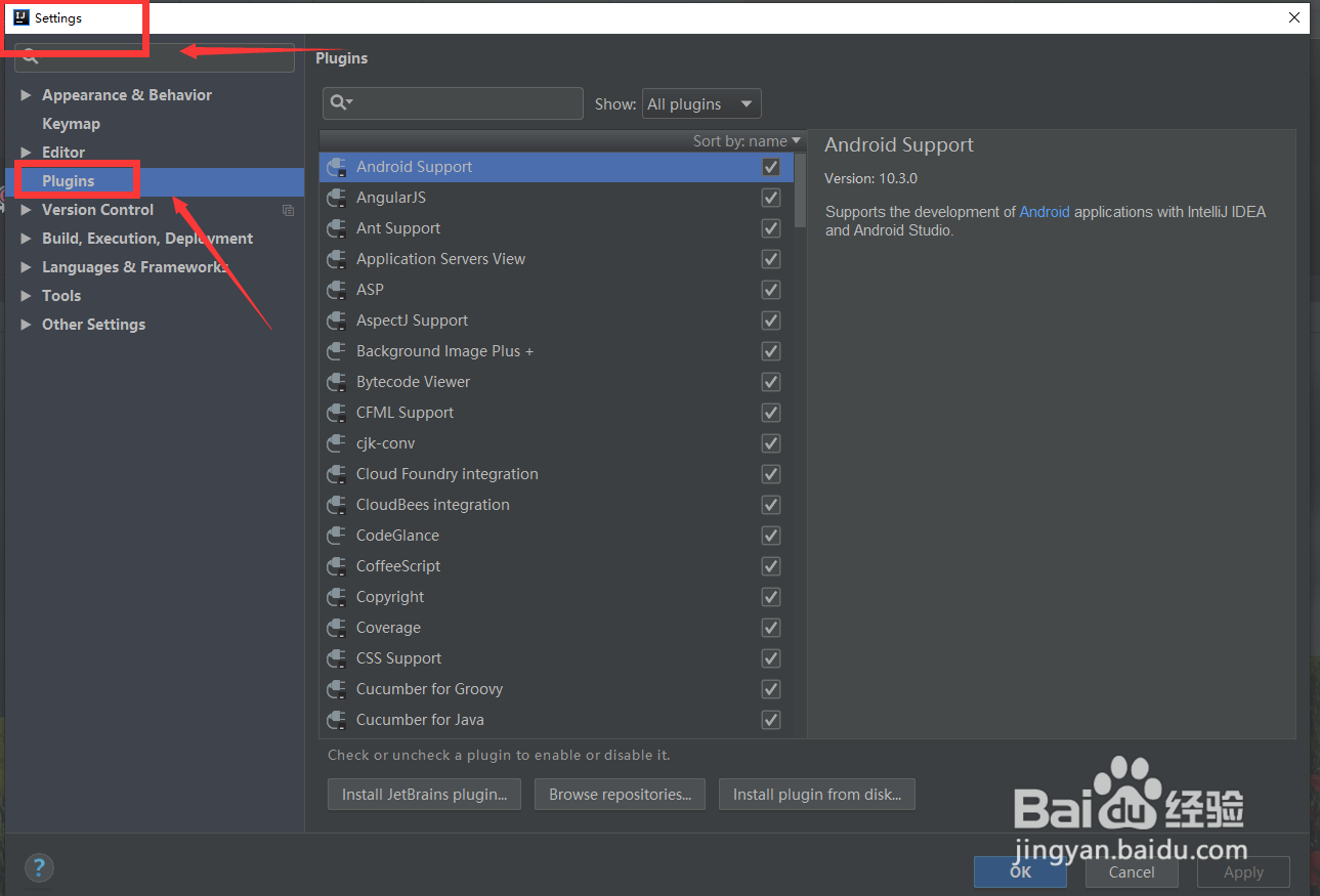 2、之后在设置窗口,找到Plugins选项。