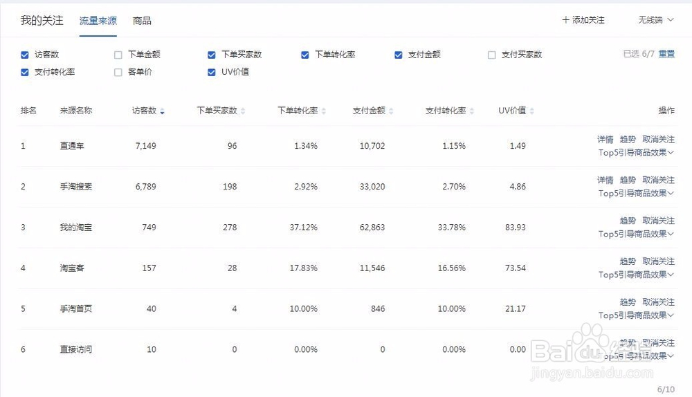 2、关注流量来源和流量排行榜,可以自定义流量来源入口监控,流量来源排行榜为店铺的流量结构提供数据,正常的店铺流量来源付费占到30%左右,搜索流量占到50%左右,其它流量如自主访问,购物车,收藏等占到20%左右。