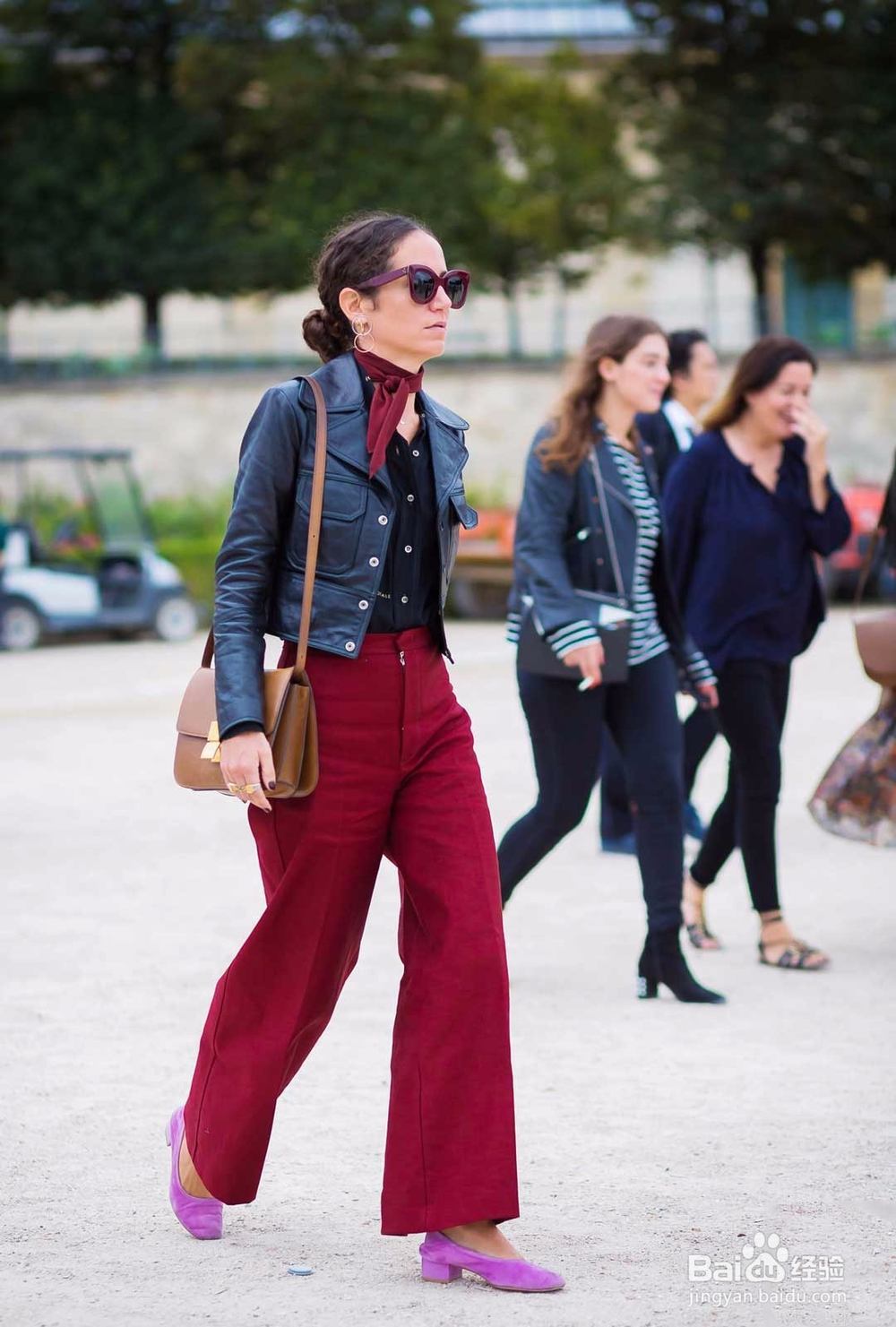 7、酒红色的丝巾和阔腿裤相互辉映,外搭牛仔外套毫无违和感,时尚大气。