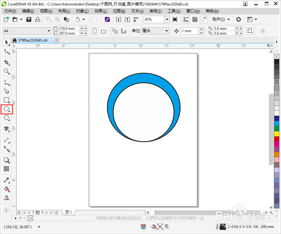 1、打开CDR软件,用椭圆形工具画出两个椭圆,轮廓设置为黑色,大圆填充为蓝色,小圆填充白色。