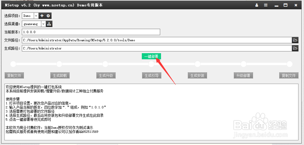 11、项目设置好后,打包过程与上面打包Demo的过程一样,选择需要打包的项目,生成路径,点击一键部署,等待完成后,就可以在设置的“生成路径”下看到制作完成的美化安装包了