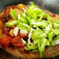 13、放入青椒和大蒜,大蒜用刀拍一下哦。