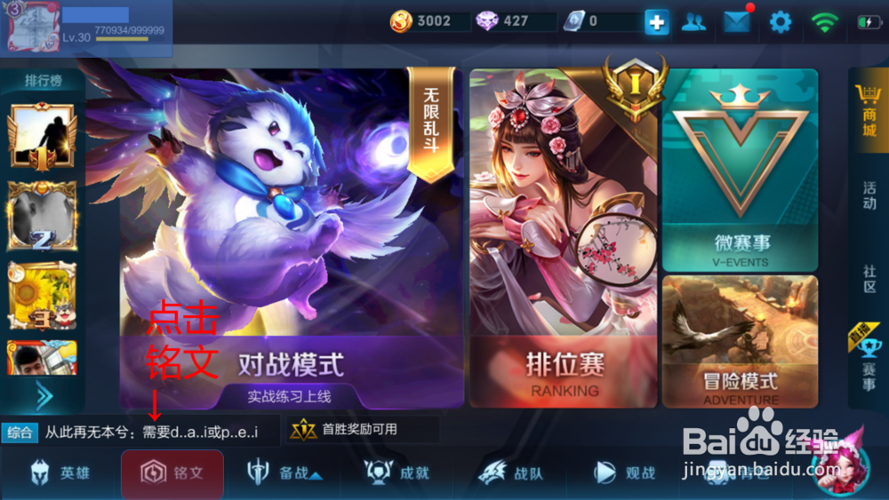 1、打开王者荣耀,进到首页,点击铭文。(购买铭文页可以用钻石外还可以用点券购买)