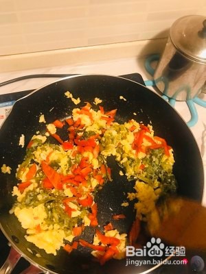 5、鸡蛋成型放入蒸好得芹菜叶和红辣椒 翻炒 放入生抽 大蒜 翻炒