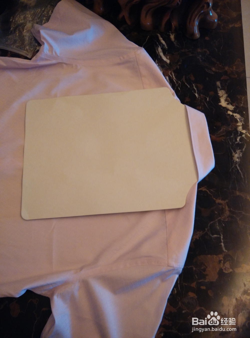 2、平铺之后我们要用纸板放在领子的中间位置,这样是为了支撑衣领的平衡度,折叠起来衣服会有棱角,不会很褶皱的。