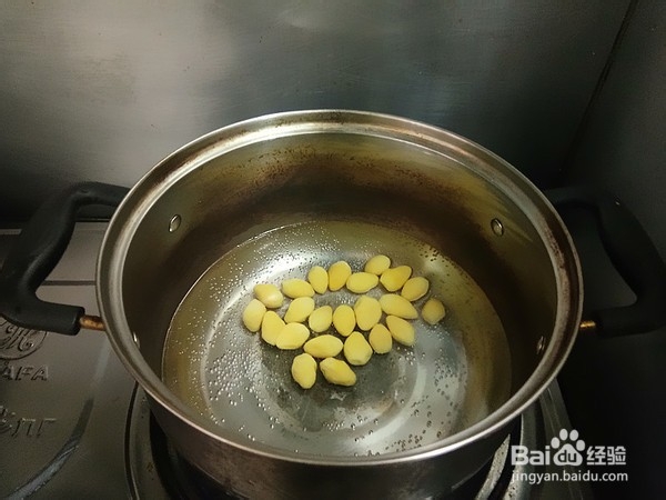 3、锅中放水烧至水沸加入少许食盐,放入白果焯水捞出,控干水份。(荷兰豆不用焯水)