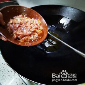 6、肉丝滑散开,肉丝炒发白,下姜蒜丝。