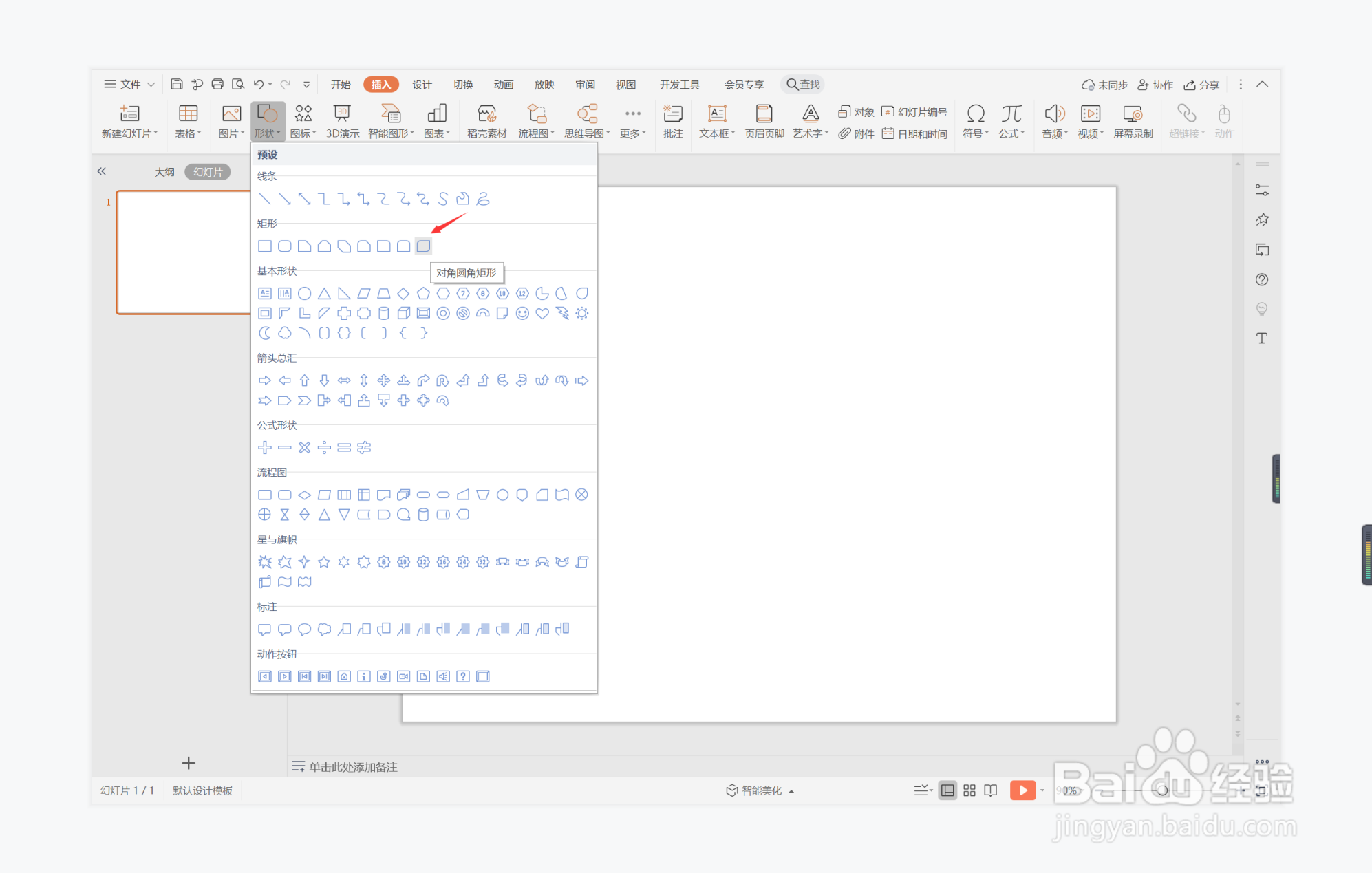 1、在插入选项卡中点击形状,选择其中的对角圆角矩形。