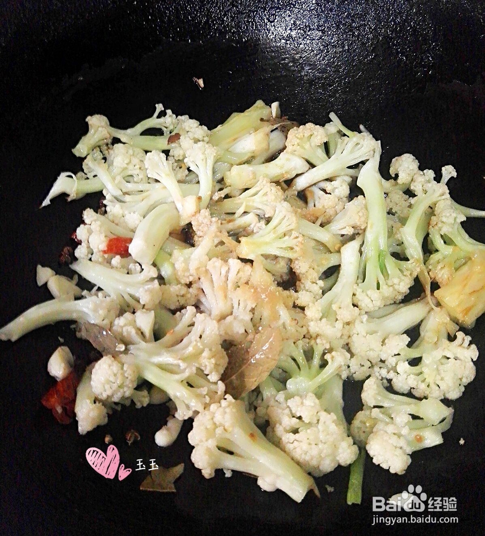 6、再把焯过水的花菜倒进去大火炒。因为焯了水的花菜也是算半熟了的,所以只要炒二分钟就好。