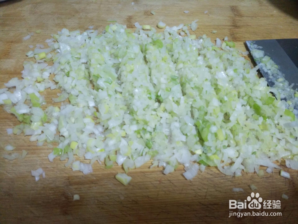 3、肉切成小碎末。(能在外面买现成做饺子馅的肉最省事)