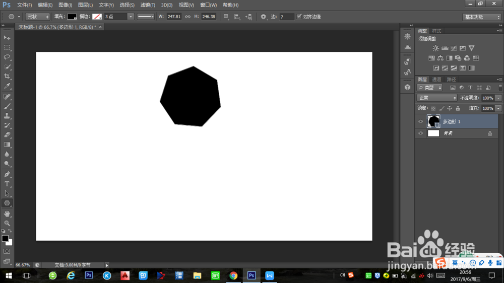 3、找到左边的多边形工具,选择就可以了,我们就要可以对我们的边数进行绘画了,在胆摸这个图片的中我需要的是正七变形,因此我们要对边数选择七才可以