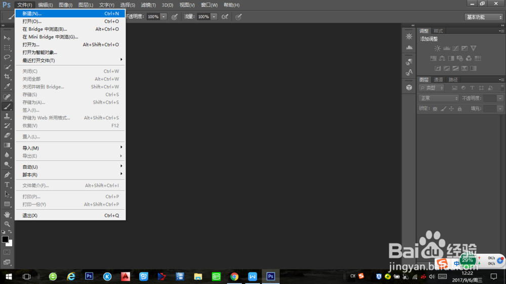 1、首先我们在我们的桌面线建立一个空白的画面用来提供我们的绘图,在左上角的下拉菜单中选择新建即可,点击新建后就会弹出一个对话框,这个对话框就是我们要新建白版的对话框,我们选择适合的大小样式,以方便后期的作图