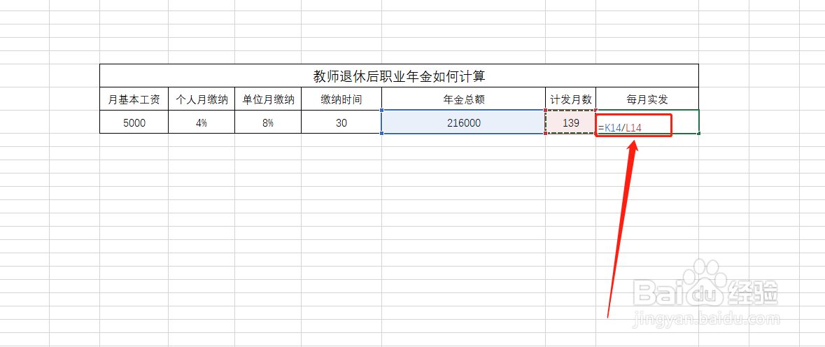 5、在“计发月数”和每月实发中填写数据,其中国家规定的计发月数为60岁退休是139个月,55岁退休是170个月。每月实发中写入公式:=K14/L14