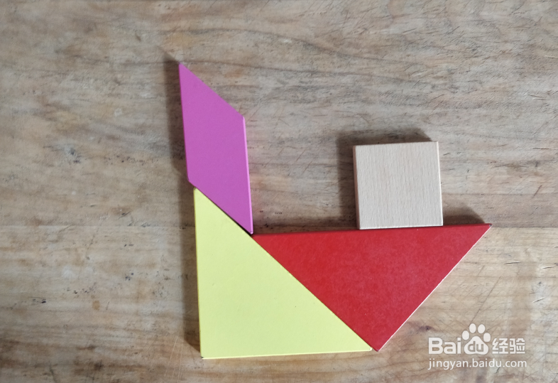 7、摆上中号三角形,放在左侧大三角形的左侧挨着,直角在右侧上端,如图。船就拼组好了。