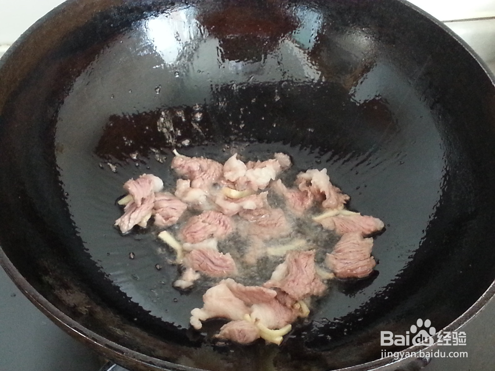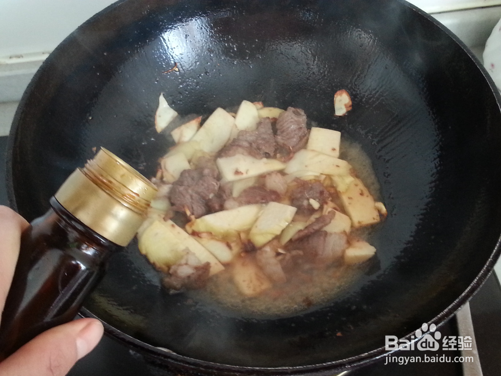 7、翻炒至笋片周围微微焦黄,加适量料酒。