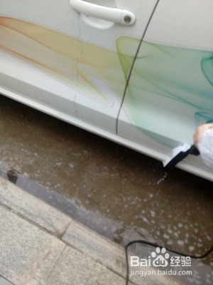 2、先用清水将车全身淋湿。冲走部分灰尘和杂物。些时不可擦车。然后用洗车海绵吸足够的洗车泡沫水将车全身涂满;