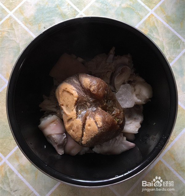6、沥干水分的猪蹄倒入锅的内胆中,加入老卤水,精盐,生抽