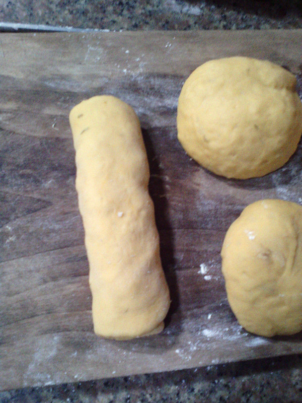 5、案板上洒少许干面粉取出面团按压排气后分成5份,滚圆松弛15分钟