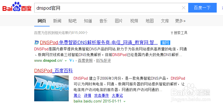 1、百度中搜索“DNSPOD官网”,找到DNSPOD官网并进入。