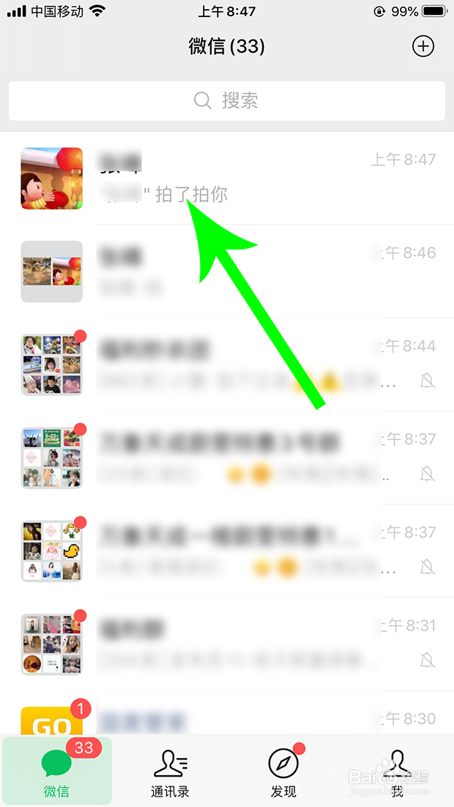 4、小张在手机上打开微信,然后在消息列表中看到““小刘”拍了拍你”,接着小张点击“消息”。