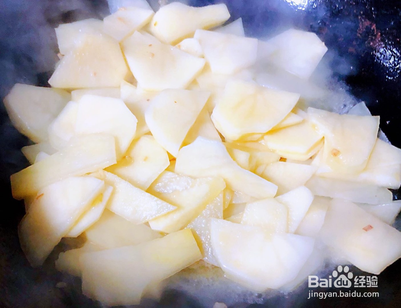 6、放入土豆片大火快速翻炒倒入醋一起炒这样土豆的口感更加脆嫩