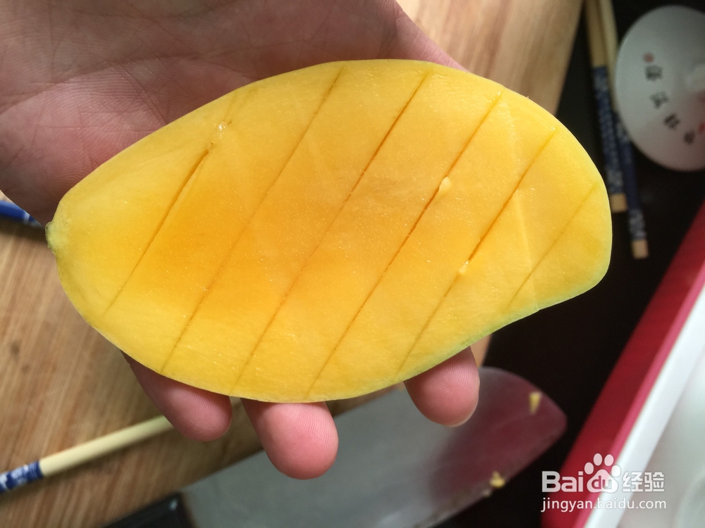 2、然后将无果核的芒果部分用刀划成渔网状。