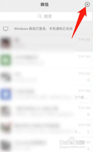 1、第一步,打开手机微信,进入首页,点击右上角的加号。