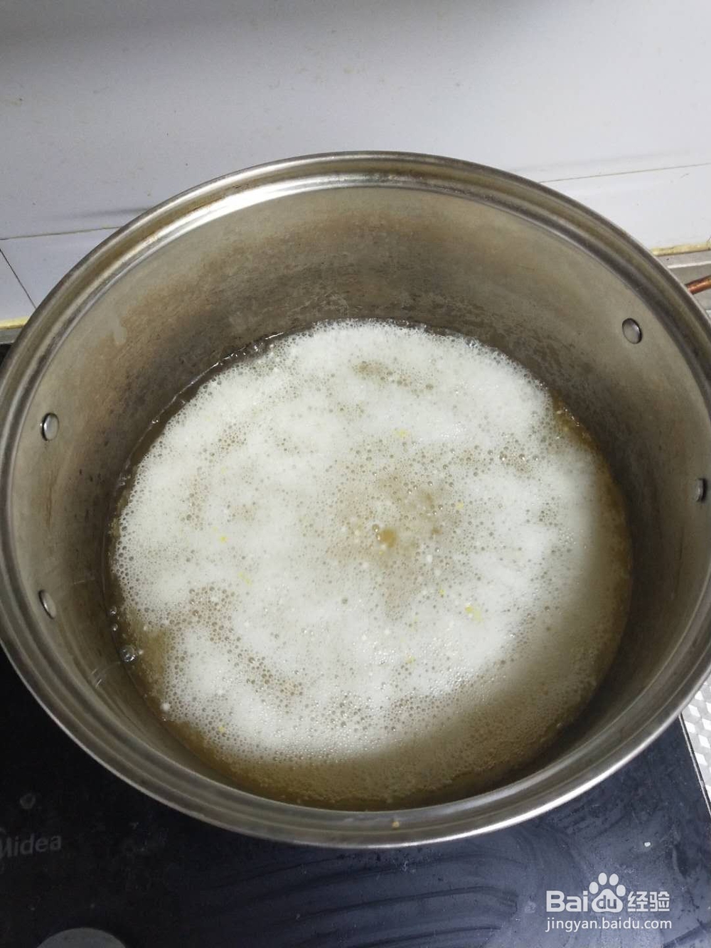 2、在水刚刚开的时候,往锅里倒入玉米槽,然后等着再次开锅后,把火关小。