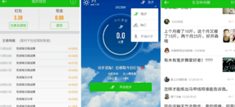 7、悦动圈:悦动圈的设计和主流的Nike+ Running 、咕咚都不一样,主界面以天气为背景,布局有些乱,字号小,尤其是运动过程中不易看清,社交互动板块的排版有待加强。悦动圈的特点是可以每日打卡得红包,完成每日任务后可以获得相应金额,虽然都是几分钱或几毛钱,经济效益微乎其微,但对于爱薅羊毛的用户还是有一定的吸引力。