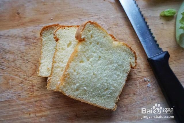 5、再放入火腿肠,在另一片面包片上放入生菜,将两片面包片盖上即成火腿鸡蛋汉堡、将蛋糕用面包刀切成约1厘米的厚片