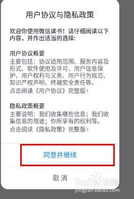 2、在弹出的用户协议与隐私政策弹窗中点击同意并继续