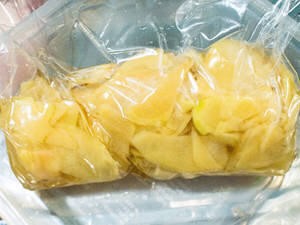 6、取一个消毒后的瓶子或夹链袋,将刚刚加热后的调味料及处理过的姜倒入,放入冰箱冷藏一晚。