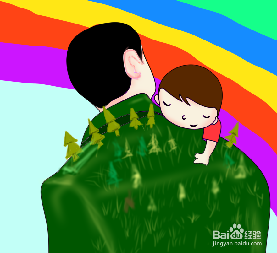 八、用黄绿色作为大人背部的高光,在背部上面画出树木和草丛。