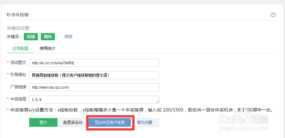 5、选择“应用配置”、“引导语句”、“活动图文”、“中 奖 楼层”进行设置,完成后点击提交。