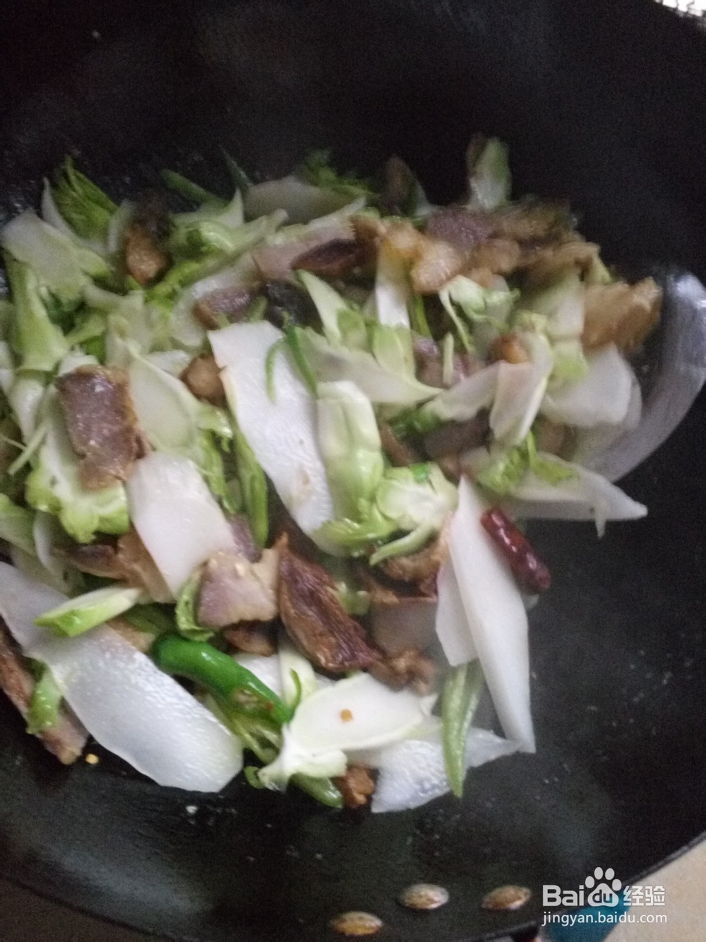 6、下入蒜苗节炒香,放入适量的盐、味精起锅即成。