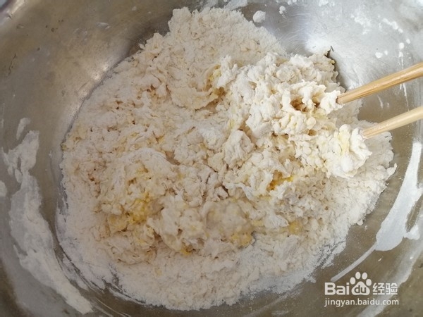 1、先把面粉放入盆中,放入盐再打入一个鸡蛋