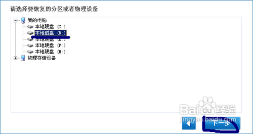 3、选择被隐藏的文件夹存放的磁盘。小编的文件夹统一存放在D盘,直接选择本地硬盘D,然后点击“下一步”进入扫描过程。