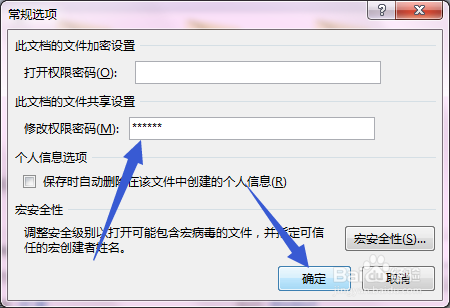 6、在常规选项窗口里——找到“此文档的文件共享设置,修改权限密码”——输入密码——点击“确定”即可。
