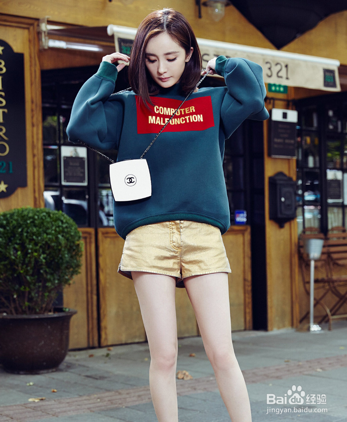 3、大幂幂加绒蓝色卫衣+黄色打底短裤