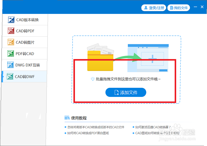 4、添加文件是前提,点击“添加文件”把我们需要转换的CAD文件添加进来;