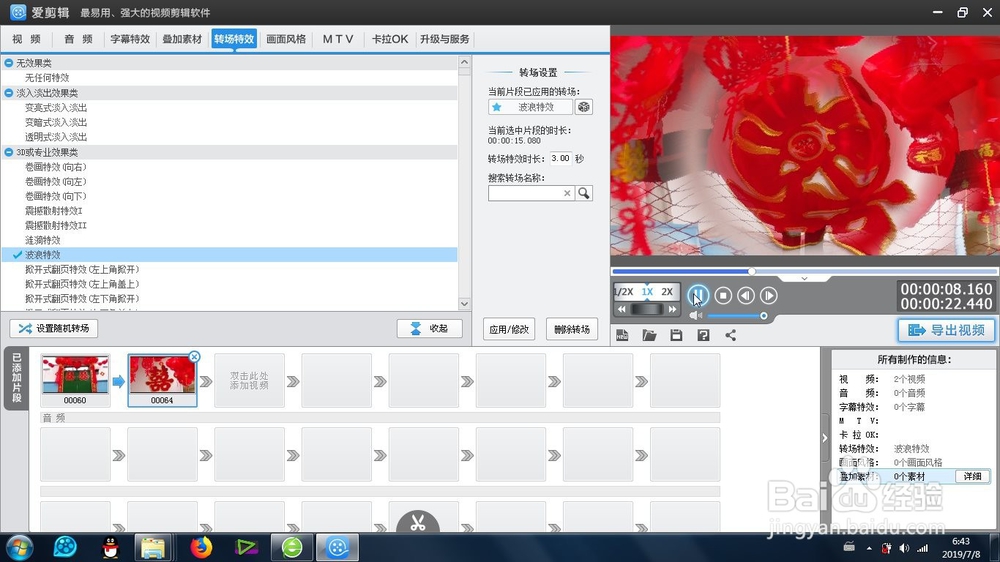 1、这个波浪特效效果的存在位置是: -转场特效-3D或专业效果类-波浪特效,一定要找到。