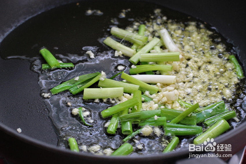 4、锅中倒适量油烧至五成热,炒香葱段和蒜末
