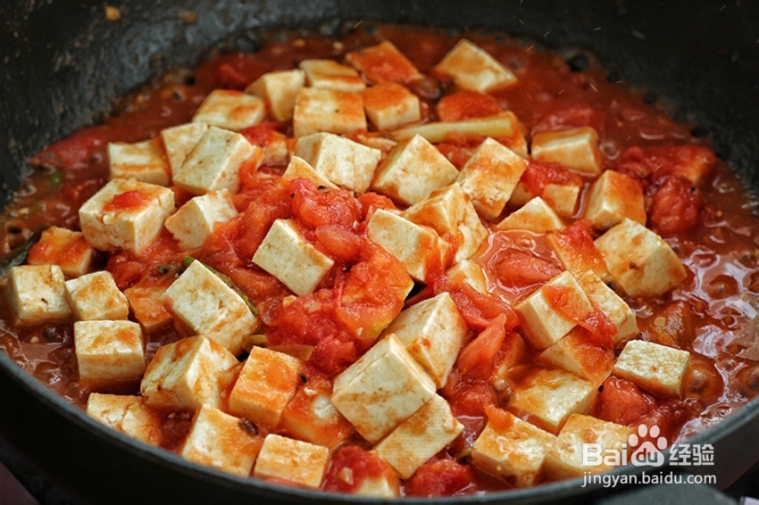 6、再放入豆腐块晃动锅子,使豆腐裹上西红柿的汤汁