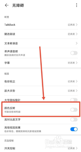6、在该界面看到“颜色反转”后边有一个开关条,将其打开即可。