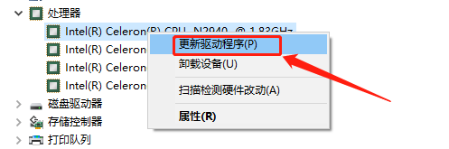 5、在对应的处理器上右键,可以更新驱动程序,如图: