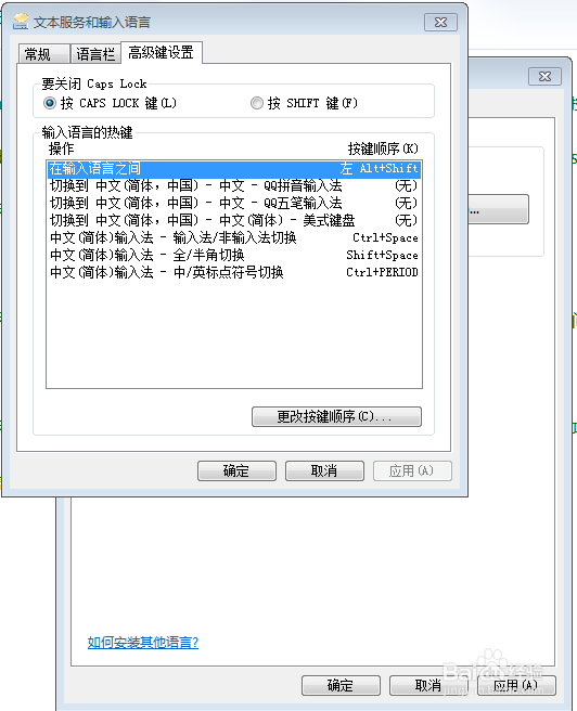 5、在“高级键设置”里,就可以更改按键顺序,也可以更改切换Caps lock的键。我还是习惯用左边的shift和ctrl一起按来切换。
