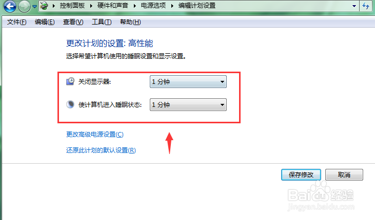 6、只要更改关闭显示器的时间,下面的睡眠状态时间会同步,然后点击保存修改即可