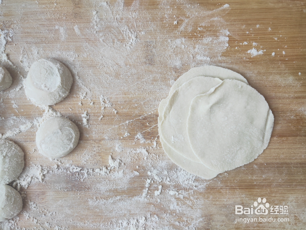 9、取一个剂子压扁,用擀面杖擀成饺子皮。